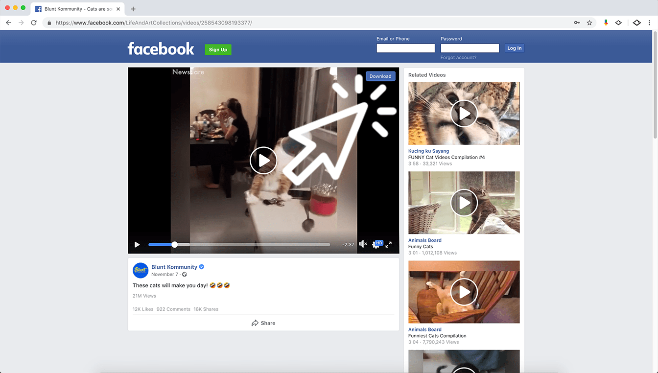 Facebook Video Downloader script allows you to download any video you want directly from Facebook site. On Facebook page with video hover your mouse on video and you`ll see "Download" button in right top corner - just click it and your video begin downloading.